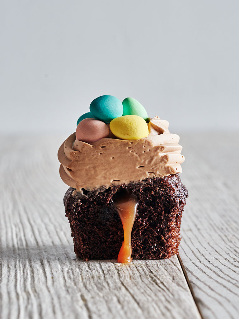 Cupcake moelleux au chocolat garni au centre de caramel au beurre salé. Il est couvert de chantilly au chocolat au lait et à la fève de tonka. Le cupcake est décoré avec des œufs en chocolat colorés!