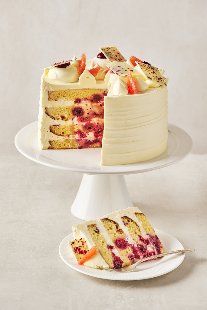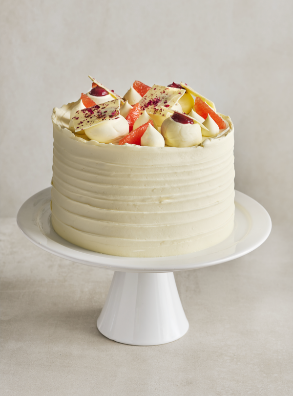 Gâteau moelleux à la vanille, au pamplemousse et framboises.  Il est garni d’un confit de framboise légèrement parfumé à la rose et d’un caramel au beurre.  Il est recouvert d’une chantilly onctueuse au chocolat blanc.
