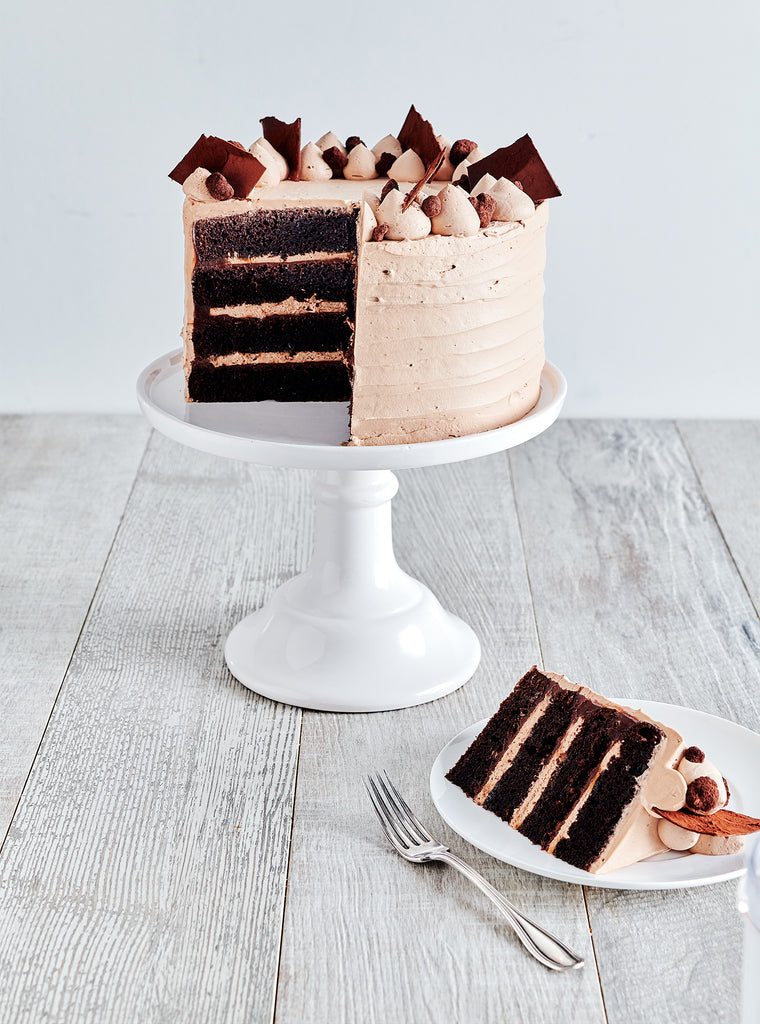 Gâteau au chocolat riche et moelleux, imbibé d’un sirop au cacao et garni d’une ganache au chocolat noir, d’une chantilly au chocolat au lait à la fève tonka*, d’un crumble de lait au cacao et d’un caramel salé. Il est recouvert d’une de chantilly au chocolat au lait et tonka et décoré d’éclat de chocolat noir et de crumble.