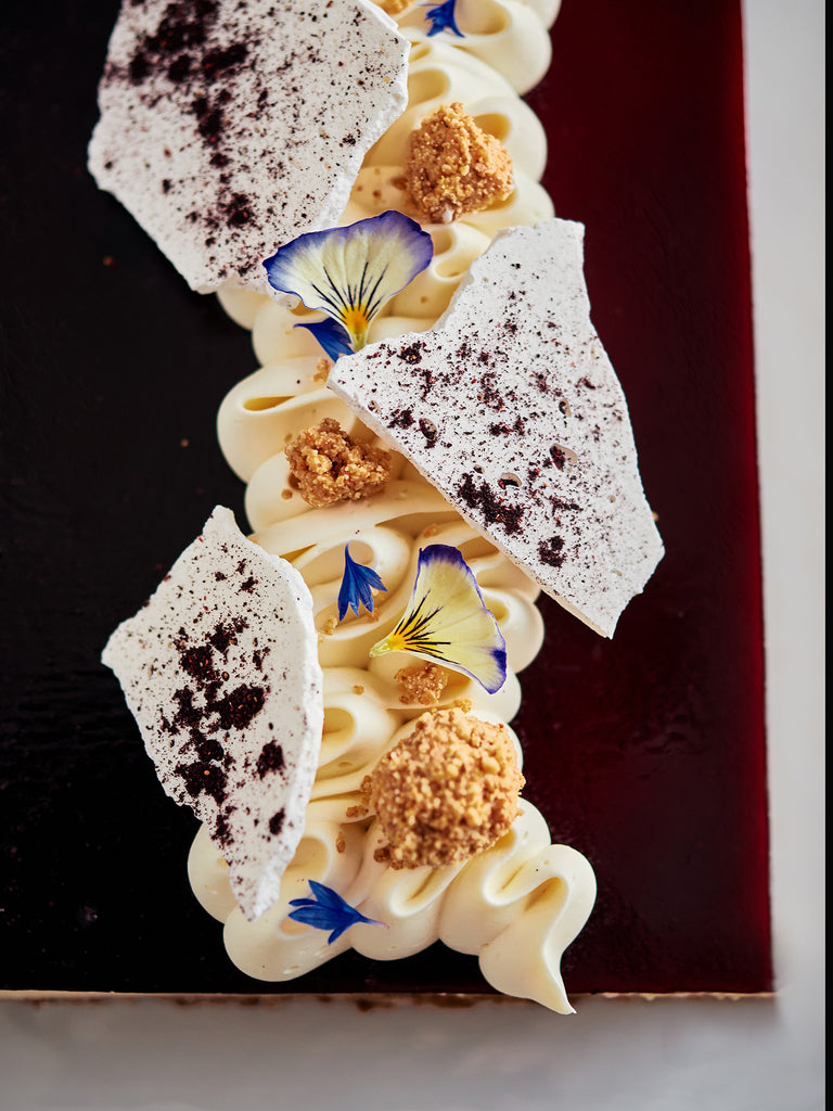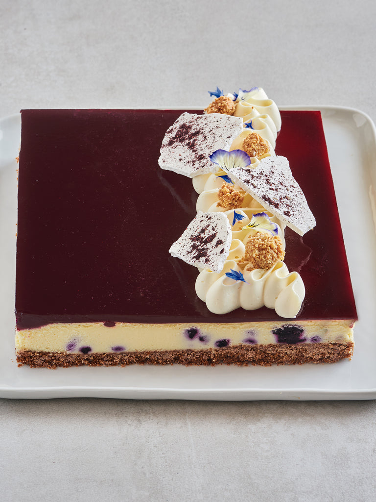 Gâteau au fromage aromatisé à l’essence de mélilot fait à base de fromage à la crème et de yogourt sur une croûte de biscuits Graham. Il est garni au centre de bleuets sauvages. Le gâteau est recouvert d’un miroir aux bleuets et est garni sur le dessus de chantilly au chocolat blanc, de crumble au graham et de fleurs fraîches.